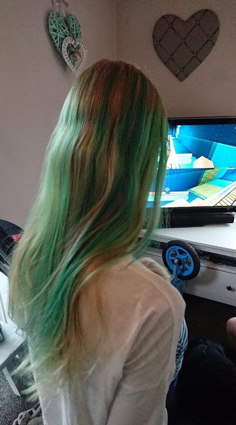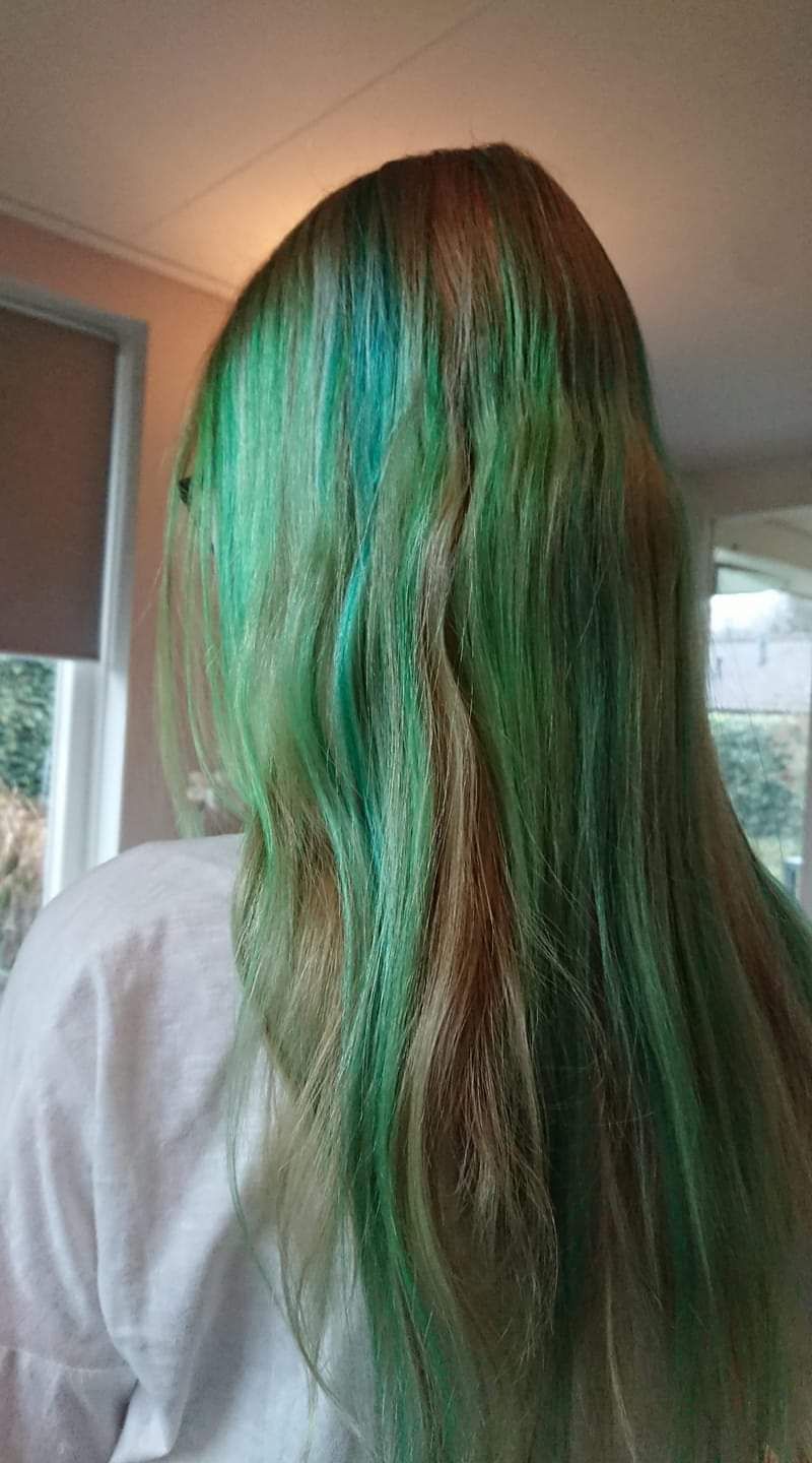 My girl wanted diverend shades of green. Whit this lush green. We made aplhine green and spring green. We dived the hair in multiple sections each witch a different shade. And repeated this each time . This is the result. 👍